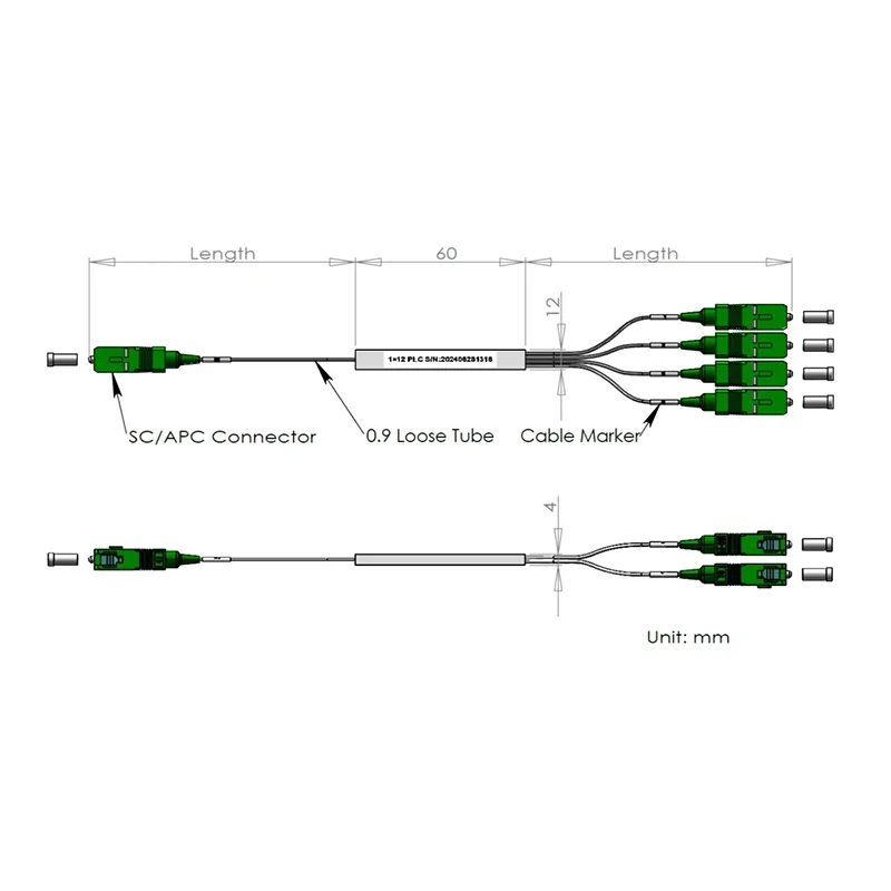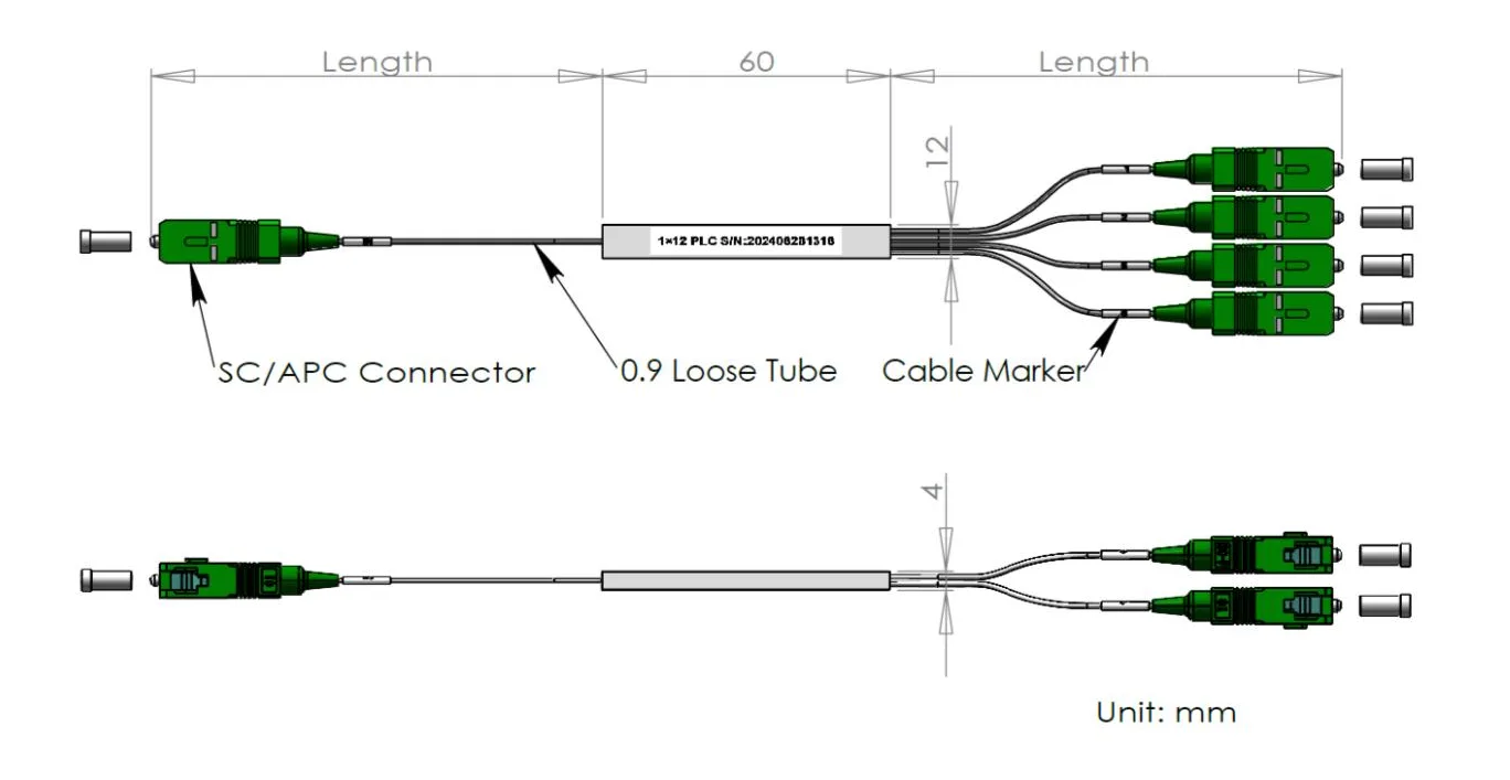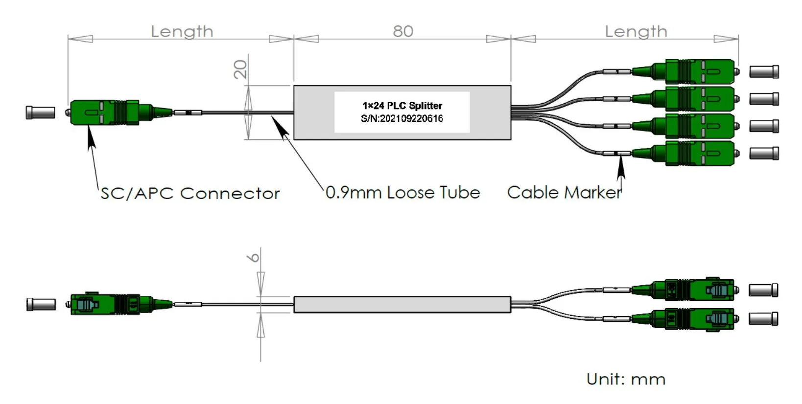 1x12/1 × 24 PLC Splitter челична цевка пакет 60x12x4 и 80x20x4mm, со 900μm лабава цевка 1.0+0,1/-0m, SC/APC конектор.