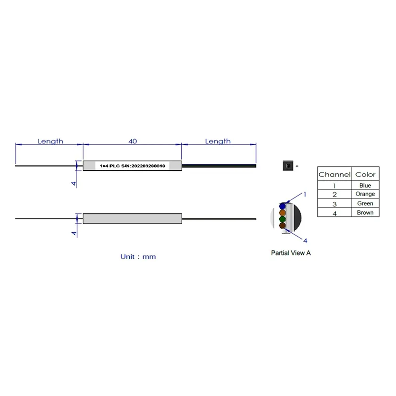 1x4/1 × 8 PLC Splitter челична цевка пакет 40x4x4mm, со 250μm голи влакна 2.5 +0,1/-0m, ниту еден конектор.