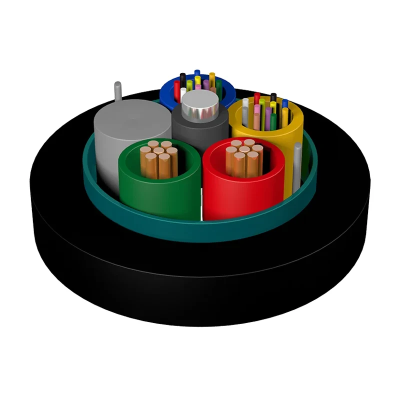 Хибридни оптички и електрични влакна на лабава цевка кабел GDTS се обликува во лабава цевка изработена од пластика со висок модул и исполнета со полнила. Центарот на оптичкиот кабел е јадро на метално засилување. Лабавата цевка и бакарна жица (како што се бара од спецификациите) се искривени околу централното јадро за засилување за да се формира кабелско јадро. Јадрото на кабелот е исполнето со оптички кабелски полнила и оклопно со брановидна челична лента, и конечно се екструдира полиетиленска обвивка.