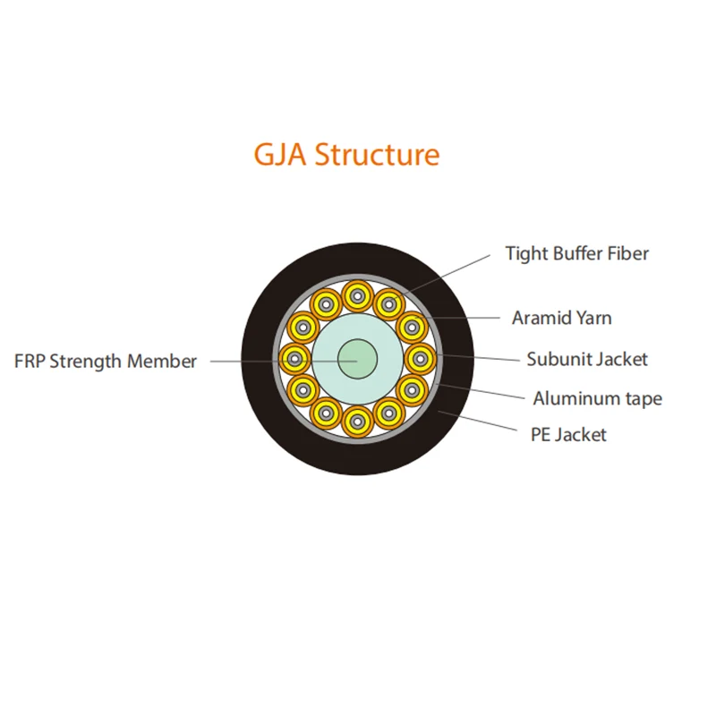 Waterproof fiber optic cable GJA uses single-core optical cable (φ900μm tight-buffered optical fiber, winding yarn as a reinforcing member) as a sub-unit, the center of the cable core is fiber reinforced plastic (FRP) as a non-metallic reinforcing member, the sub-units are twisted around the cable core, the cable core is covered with Алуминиум-полиетилен ламинат, а кабелот е покриен со полиетиленска обвивка.